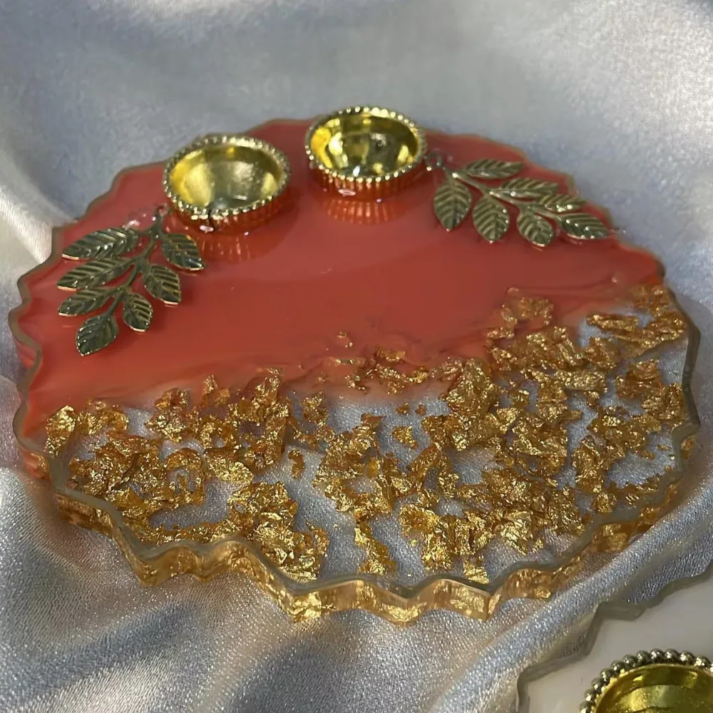 Designed to hold essential ceremonial items such as rings, kumkum (vermilion), akshata (rice grains), sweets, and flowers, the thali features beautifully segmented sections, ensuring a clean, organized, and photogenic arrangement. The use of resin not only makes the thali durable and long-lasting but also allows our artisans to incorporate intricate designs like floral motifs, gold foil accents, pearl beading, and romantic themes such as hearts, initials of the couple, or date embossing into the artwork itself.